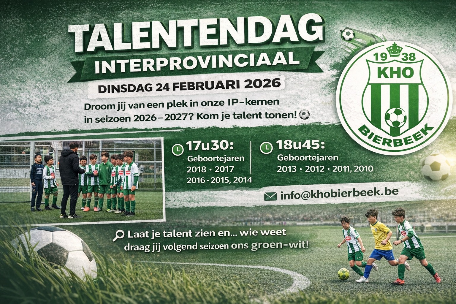 Als je de ambitie hebt om in een Interprovinciaal jeugdteam van KHO Bierbeek te voetballen, kan je je talenten tonen in een training en dit op dinsdag 24 februari 2026 :