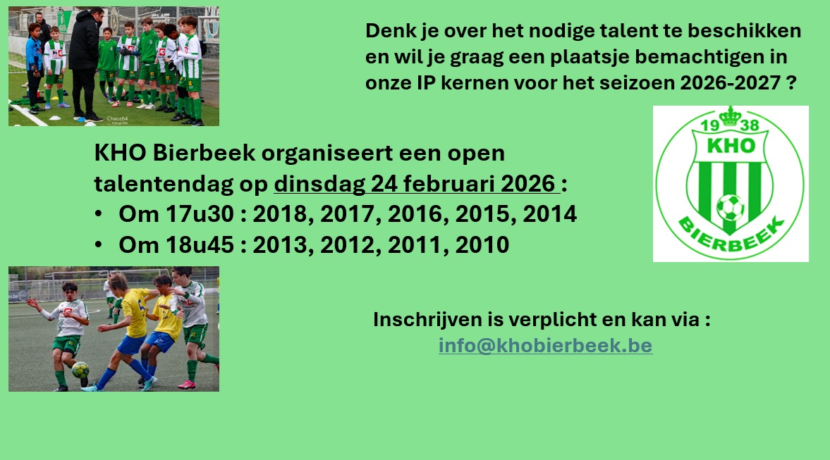 Als je de ambitie hebt om in een Interprovinciaal jeugdteam van KHO Bierbeek te voetballen, kan je je talenten tonen in een training en dit op dinsdag 24 februari 2026 :