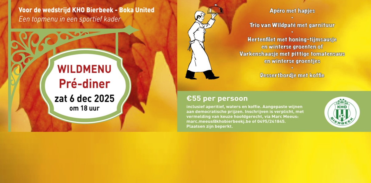 Ter gelegenheid van de wedstrijd tegen Boka Utd op 6 december, biedt KHO Bierbeek een wildmenu aan.